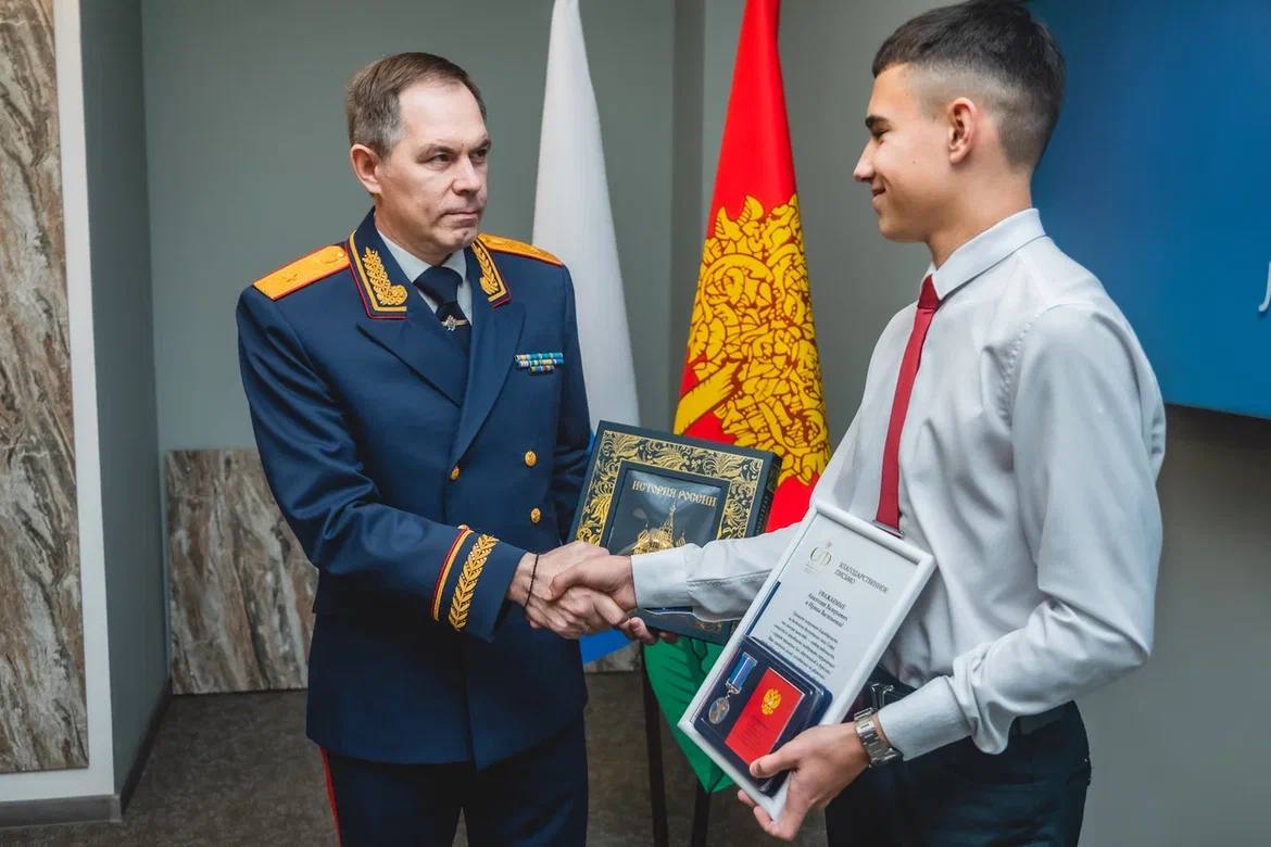 Руководитель регионального управления СКР Евгений Шаповалов встретился с 14-летним Егором Злобиным из Добринского округа. Минувшим летом он предотвратил возможные тяжёлые последствия пожара на автозаправке.