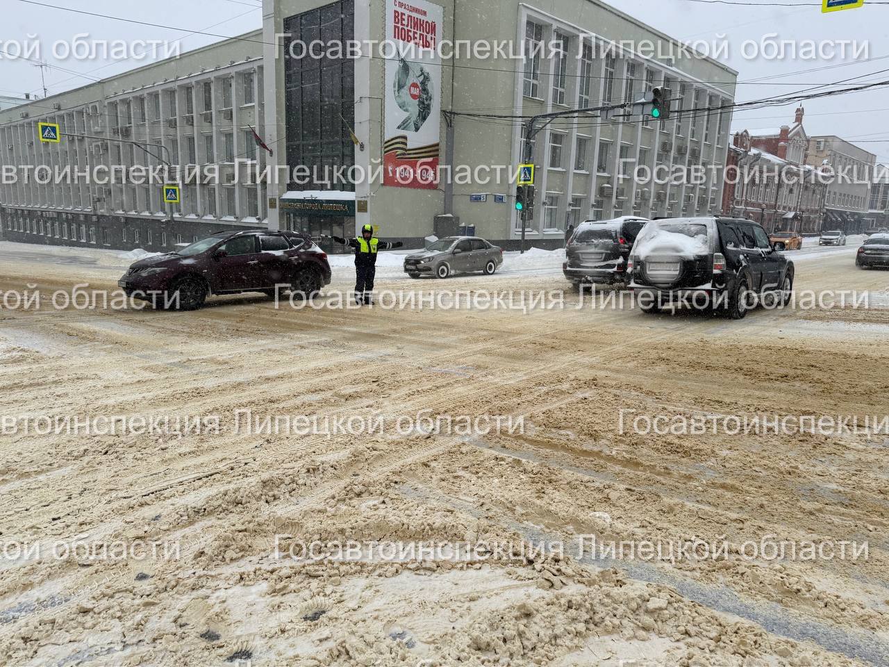 В связи с ухудшением погодных условий в виде сильного снега и метели и осложнением дорожной обстановки на спусках и подъемах, в целях предупреждения ДТП сотрудники Госавтоинспекции осуществляют регулировочные действия на пл. Театральной г. Липецка.