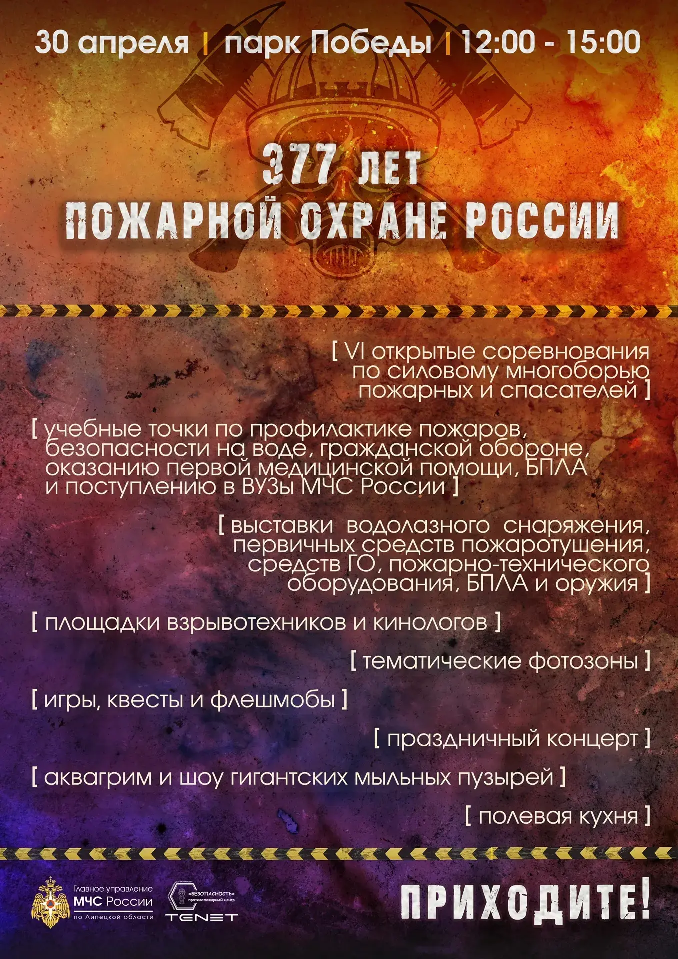 в парке Победы будут открыты различные учебные точки по профилактике пожаров, безопасности на воде, гражданской обороне, оказанию первой медицинской помощи, БПЛА и поступлению в ВУЗы МЧС России;