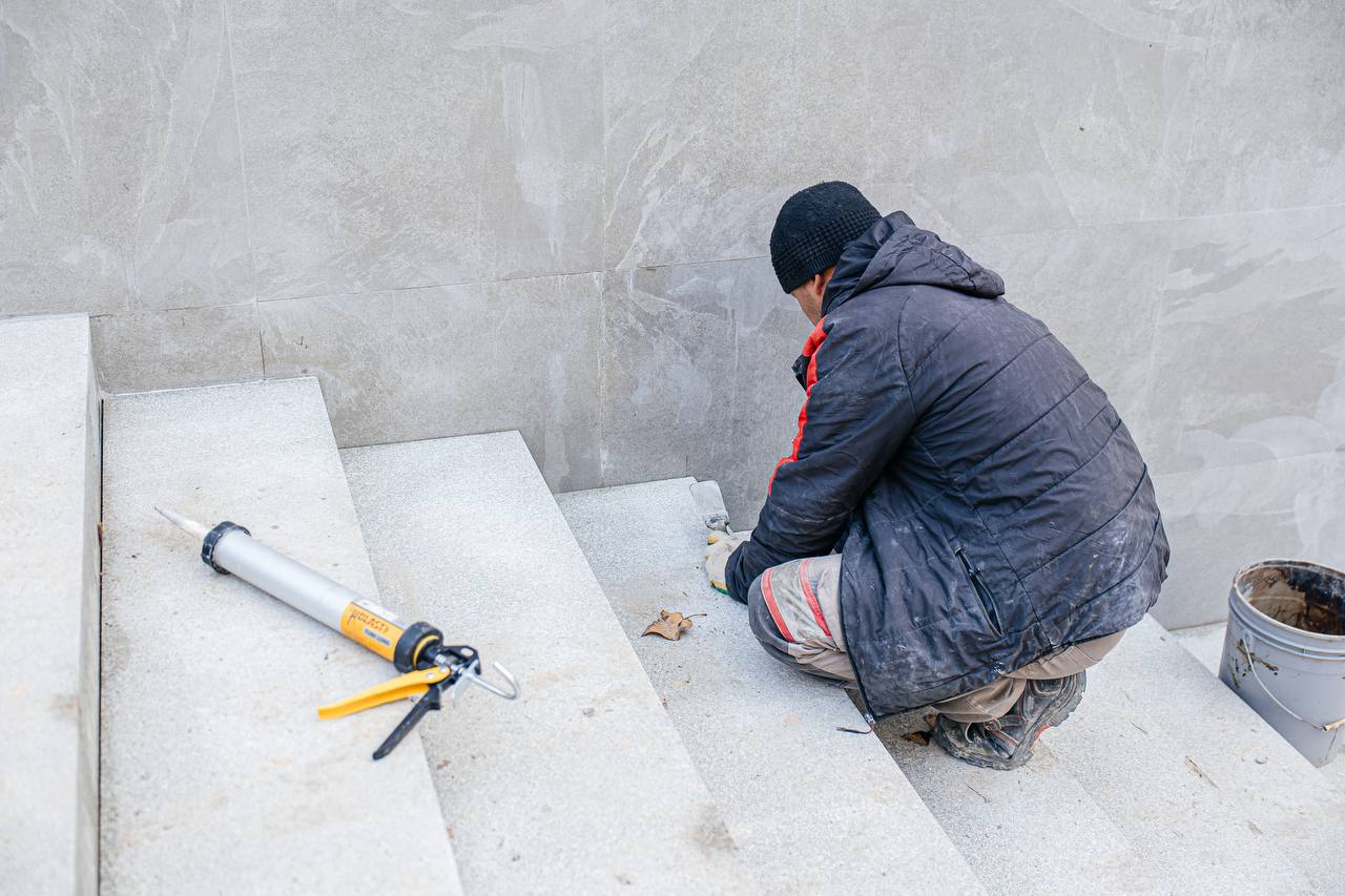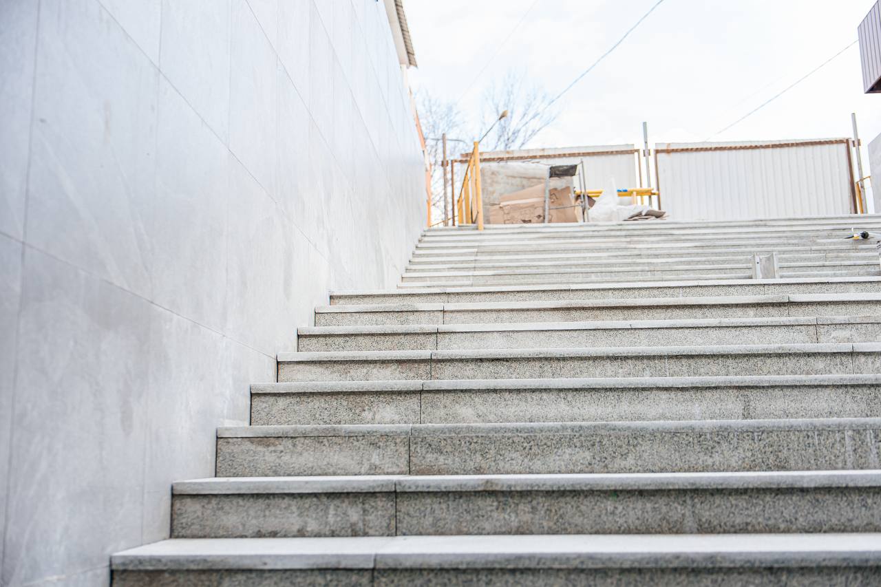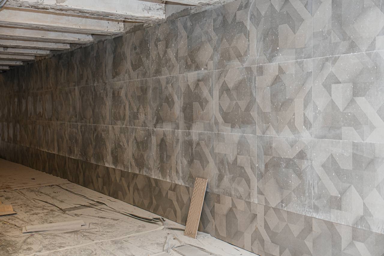 За несколько месяцев здесь проделали большую работу. Восстановлены подпорные стены, отремонтированы ступени, обновлены сети дождевой канализации. Сейчас мастера облицовывают входные группы гранитом и внутренние стены керамогранитом. Уже начали укладывать топпинговый пол – прочное, современное покрытие, которое выдержит большие нагрузки и прослужит долгие годы. После этого установят подвесной потолок.