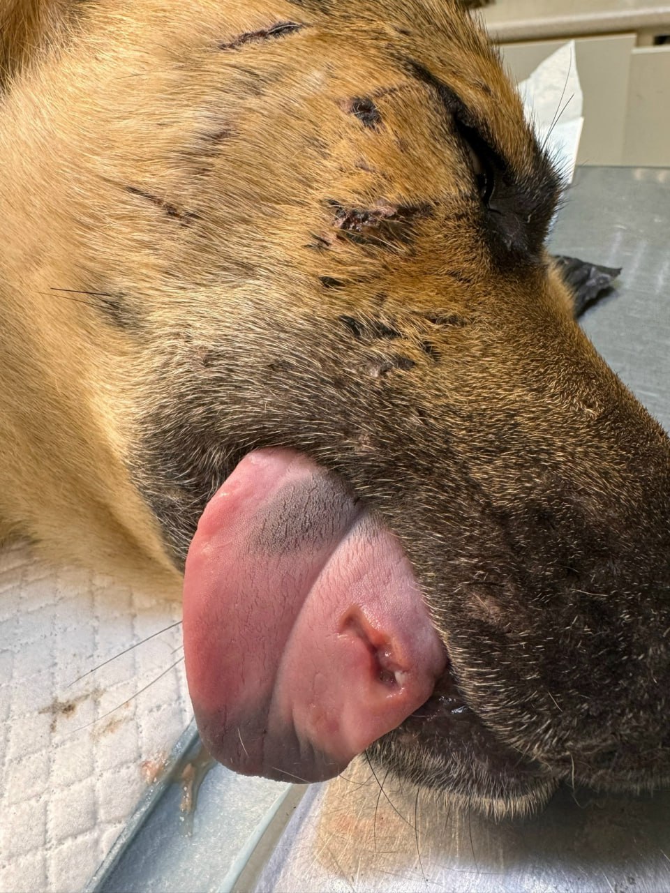 Беспородный пёс Дружок чудом выжил после нападения неизвестных. Его доставили к ветеринарам с порезами на шее, спине, ноге и с израненным языком. Медики предположили, что такие раны могли нанести лопатой или ножом.