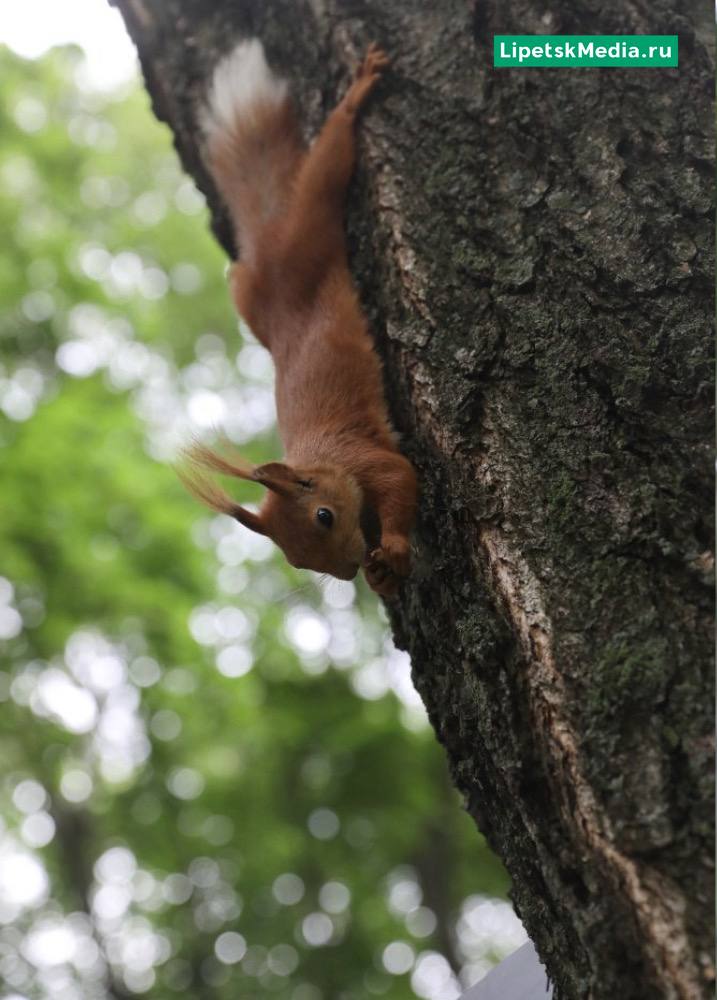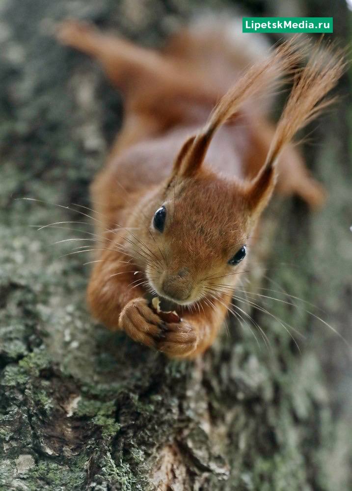 Такие шикарные кадры наш корреспондент снял во время обычной прогулки по Липецку. Пушистый зверёк уютно устроился на стволе дерева и начал набивать щёки орешками.