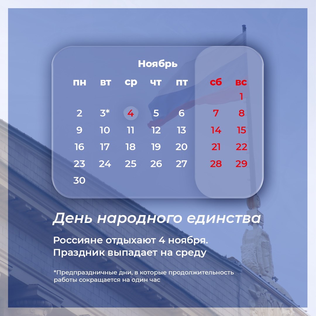 День народного единства 4 ноября выпадает на среду, поэтому будет только один выходной.