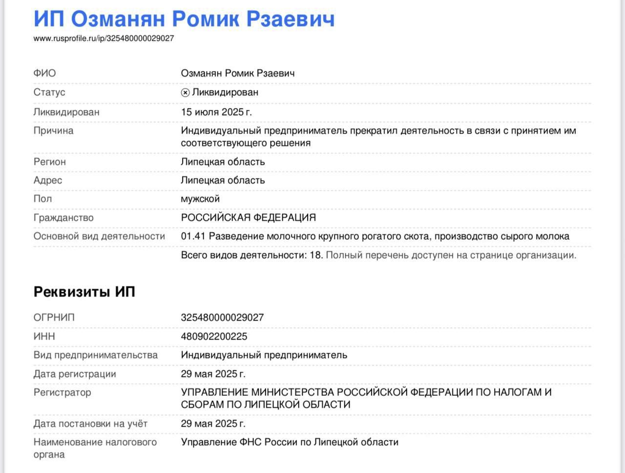Для получения статуса "нуждающегося" предприниматель ликвидировал своё ИП (бизнес в сельском хозяйстве) в июле прошлого года.