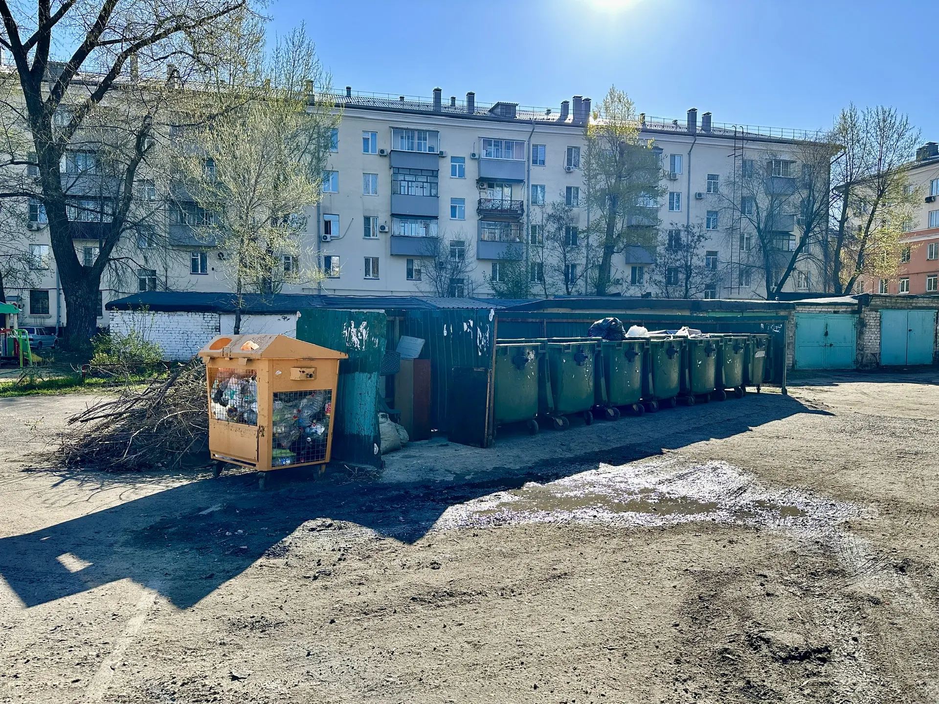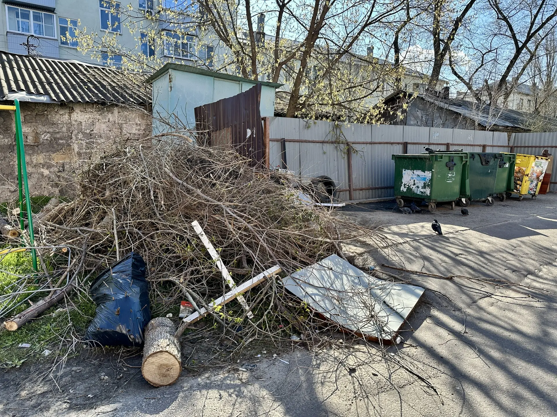 Картина, к сожалению, во многом повторяется от района к району. Сами площадки чаще всего в более-менее нормальном состоянии, а вот с крупногабаритным мусором есть проблемы – ветки, шины, всё это складируется рядом и портит общий вид.