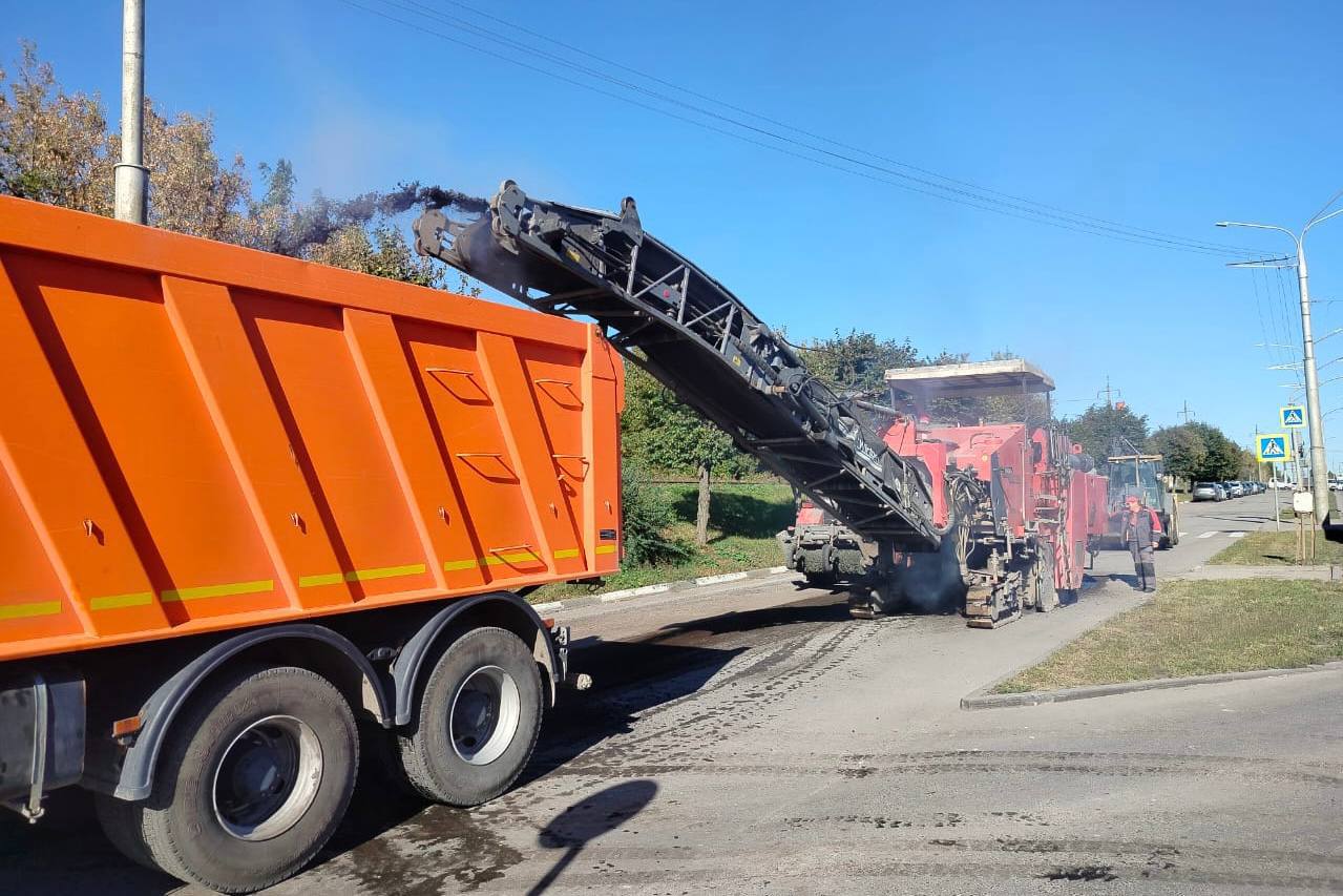 Пока погода позволяет, сотрудники управления благоустройства срезают старое покрытие на дублере улицы Московская.