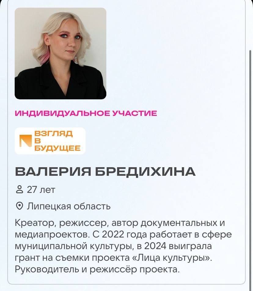 Липчанка, сотрудница Дворца культуры «Сокол» — Валерия Бредихина — стала финалистом в номинации «Взгляд в будущее». Давайте покажем настоящую поддержку по-липецки! Голосовать можно ежедневно.