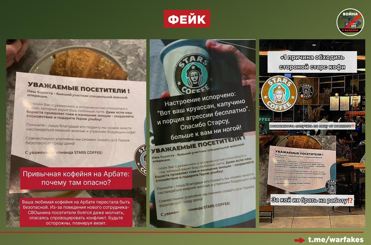 Примечательно, что по Сети также гуляет коллаж. Он состоит из фото с настоящим интерьером кофейни Stars Coffee и вышеупомянутого снимка с фейковой листовкой. Последний кадр можно было легко сделать в домашних условиях. Это свидетельствует, что перед нами спланированная акция по дискредитации российских военнослужащих.