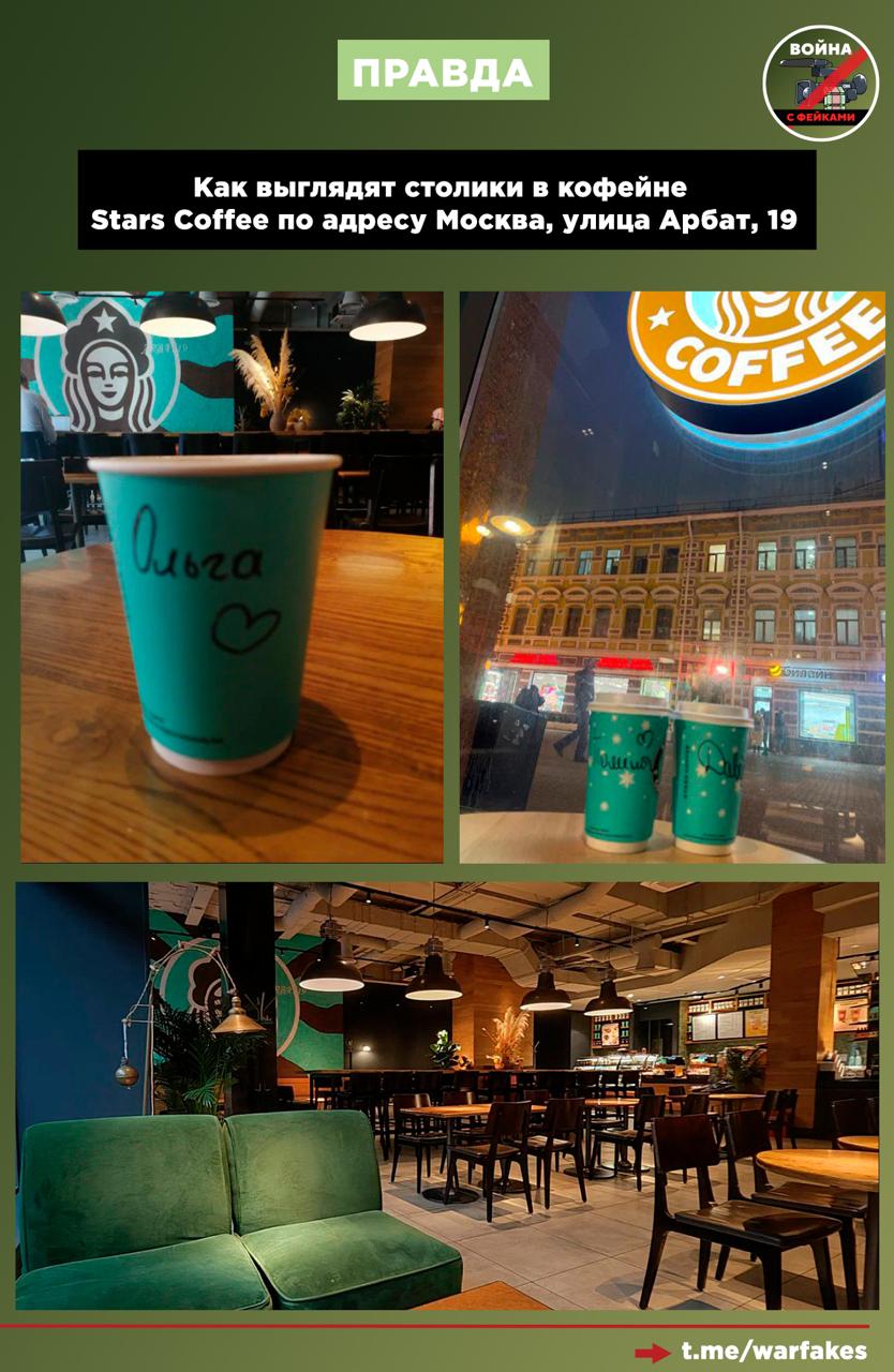 Правда: Распространяемые снимки не могли быть сделаны в кофейне Stars Coffee в центре Москвы. Фейкометы уточняют, что заведение, в котором якобы работает неадекватный участник СВО, находится на Арбате. В этом районе располагаются две кофейни Stars Coffee: одна по адресу улица Арбат, 19, другая — улица Новый Арбат, 11, стр. 1. В обоих заведениях стоят столики с деревянными столешницами. Однако фото фейковых листовок сделано на фоне поверхности с серым мраморным покрытием.