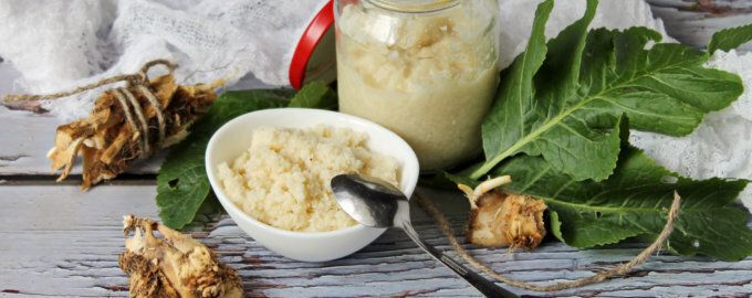 - Корень хрена (500-550 г) — основа соуса, с характерным острым вкусом.