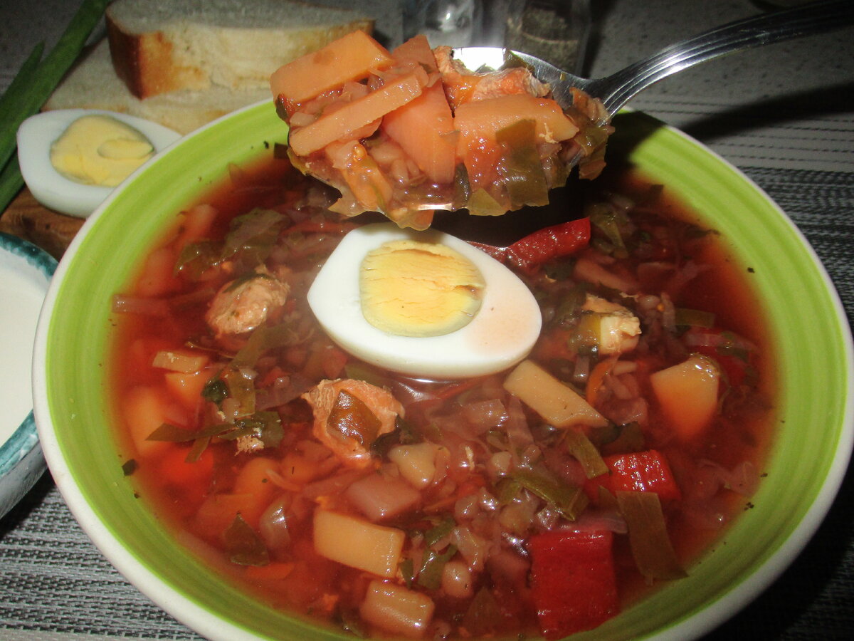 После этого можно смело добавлять заготовки из капусты и лечо, предварительно тщательно перемешав. Все это нужно варить еще 5-8 минут, прежде чем добавить свеклу, замороженную зелень и специи. Соль уточняется по вкусу. После 5 минут варки кастрюлю можно убрать с плиты и дать свекольнику настояться под крышкой.