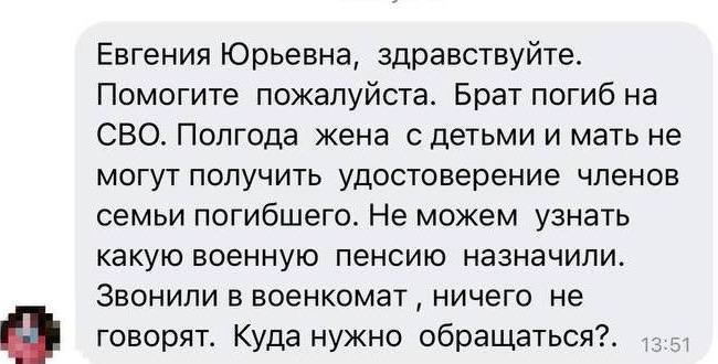 «Евгения Юрьевна, здравствуйте. Помогите пожалуйста. Брат погиб на СВО. Полгода жена с детьми и мать не могут получить удостоверение члена семьи погибшего ветерана боевых действий»