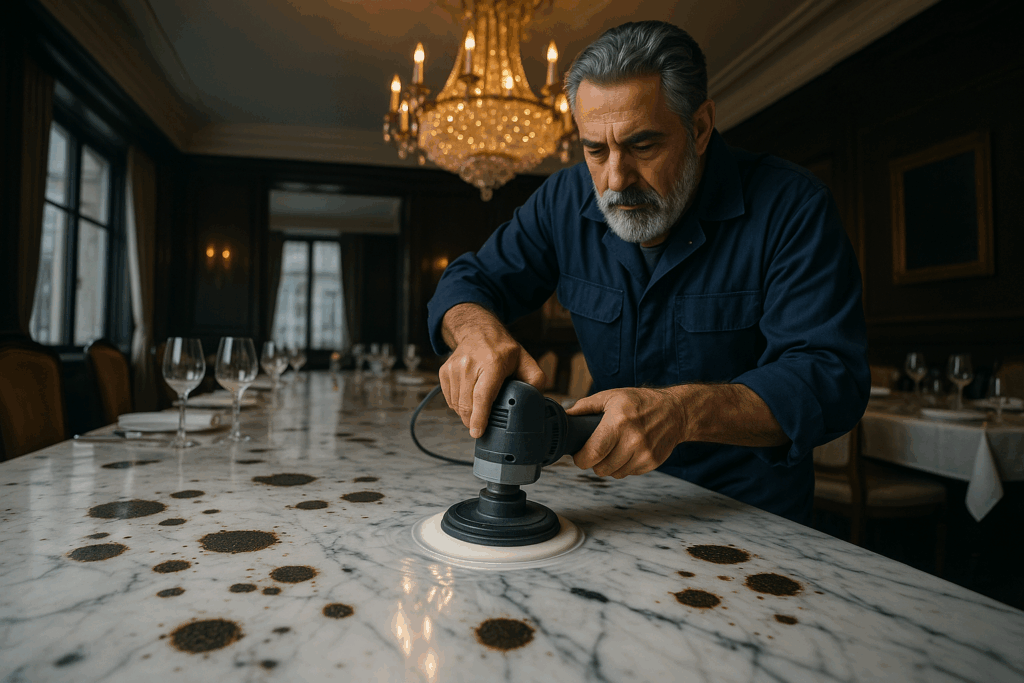 Таким образом, регулярная защита мраморных столов — это не только сохранение эстетического вида, но и возможность избежать значительных затрат на реставрацию, обеспечивая долгий срок службы для одного из самых привлекательных элементов интерьера ресторана.