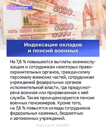 Повышаются оклады и пенсии военнослужащих, силовиков и бюджетников на 7,6%. Также самозанятые, субъекты МСП смогут взять кредитные каникулы раз в пять лет на срок не более шести месяцев, а страхование долгосрочных вкладов увеличится до 2,8 млн рублей.
