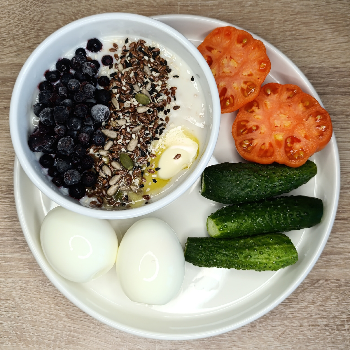 С утра была приготовлена геркулесовая каша, обогащенная семечками, маслом и черникой. В сочетании с вареными яйцами и свежими овощами завтрак стал не только полезным, но и очень вкусным. К этому напитку подан кофе с молоком, что добавляет аромат и бодрость на старт дня.