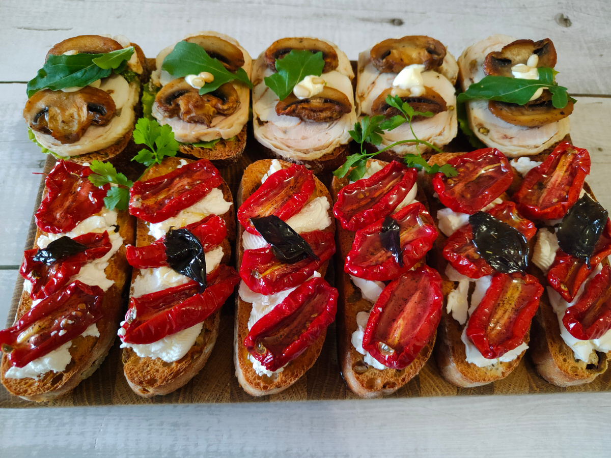 1. Брускетты с вялеными томатами: На ломтик чиабатты намажьте творожный сыр, не размазывая. Вилкой аккуратно разложите вяленые томаты, предварительно стряхнув лишний жир. В завершение украсьте свежим фиолетовым базиликом.