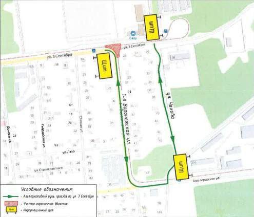 Ограничения на пересечениях по ул. 3 Сентября с ул. Воронежской и ул. Чехова будут действовать с 7 утра 8 октября до 7 вечера 12 октября для укладки асфальта, сообщили в мэрии.
