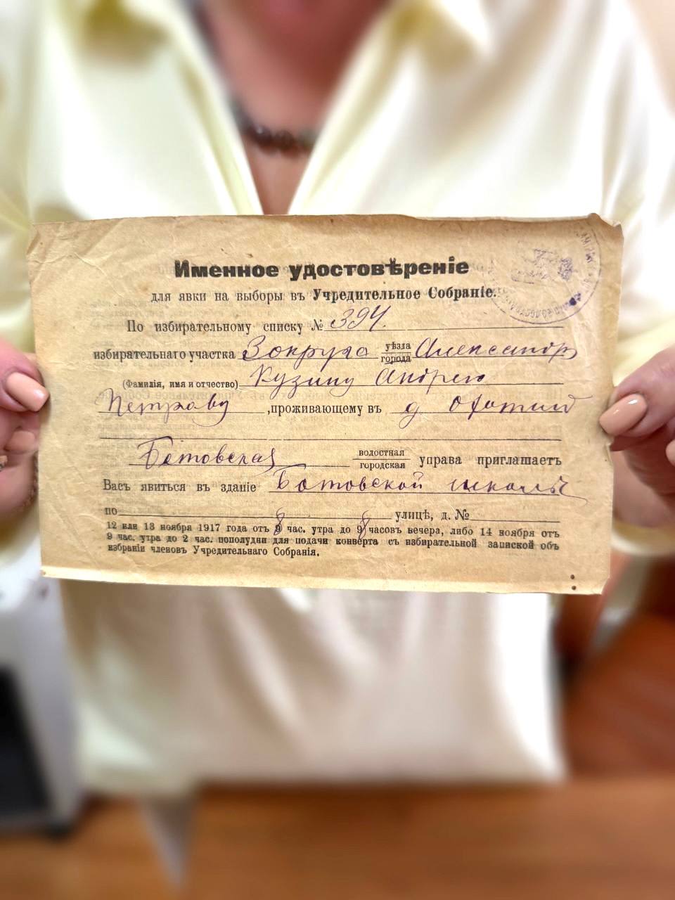 Семья местного жителя долгое время хранила и передавала из поколение в поколение документ прадеда - именное удостоверение с приглашением на выборы 1917 года!