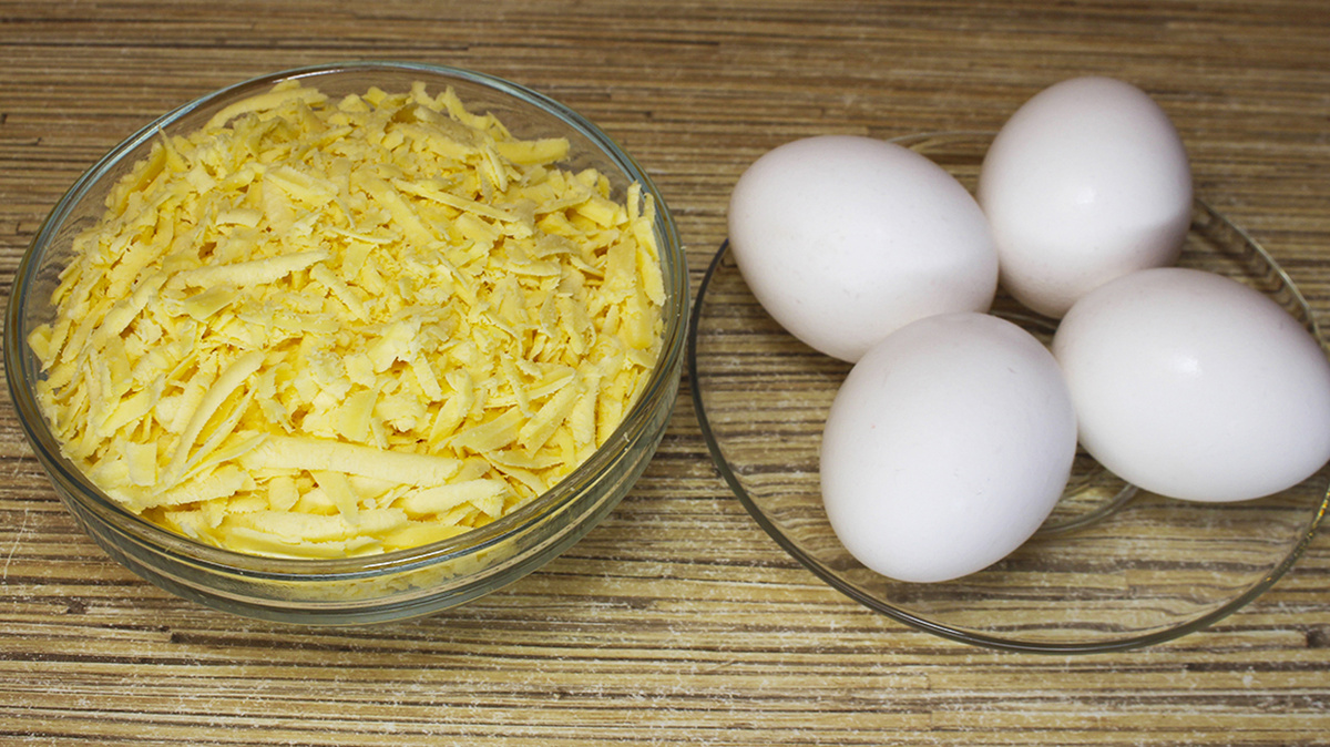 Для начала необходимо приготовить яично-сырной корж. В глубокой миске смешиваются 150 г натертого на крупной терке сыра с четырьмя яйцами. Затем добавляется три столовые ложки пшеничной муки и три ложки сметаны. После этого все ингредиенты тщательно перемешиваются до получения однородной массы.