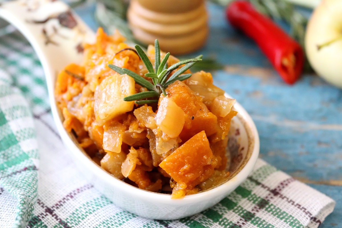 Процесс создания этой овощной икры потребует примерно 1,5-2 часа, включая все стадии подготовки и запекания. Овощи и яблоки стоит тщательно очистить и нарезать кубиками. Лук нарезается мелко, а чеснок — пластинами.