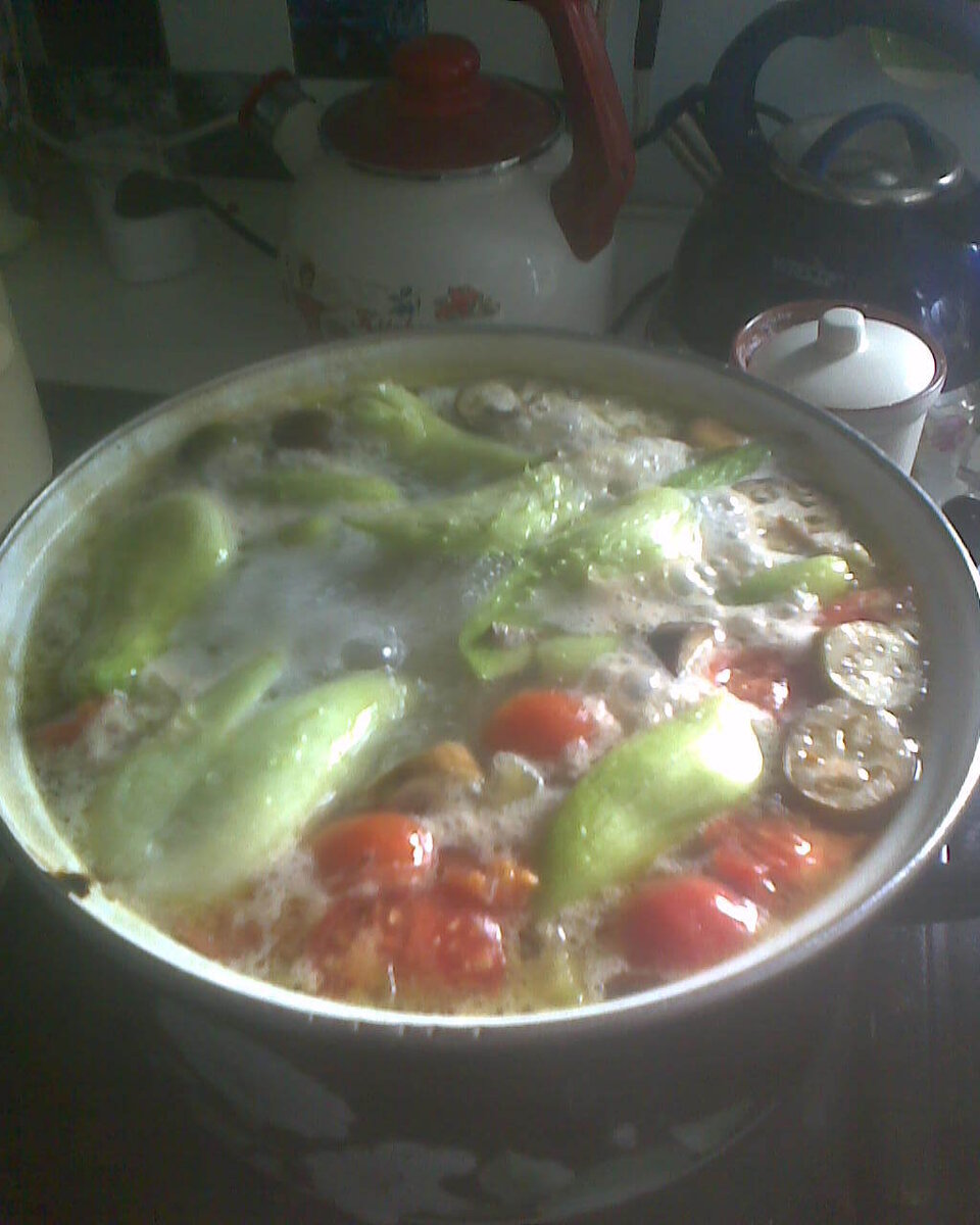 По завершении варки косточки необходимо удалить, а все мясо, которое удастся снять, вернуть обратно в кастрюлю. Затем в бульон добавляют нарезанную картошку, болгарский перец, мелко нарезанные баклажаны и очищенные перуанские огурцы без семян. Семена следует удалить, так как они могут испортить текстуру супа.