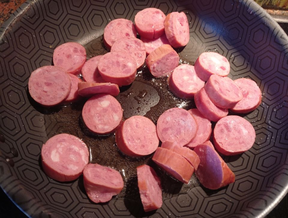 Первый шаг — нарезка колбасы. Кружочками или кубиками, как вам удобнее, она должна обжариться до золотистой корочки на сковороде с растительным маслом. После этого в ту же сковороду добавляется мелко нарезанный лук, который следует обжаривать вместе с колбасой до мягкости.