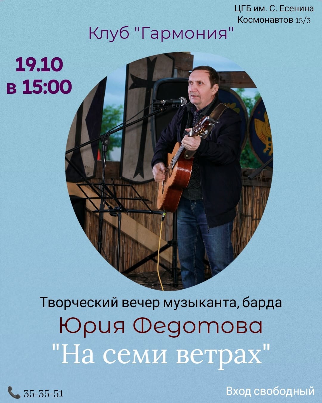 Творческий вечер пройдёт в библиотеке. А соберёт всех для разговоров по душам Юрий Федотов – музыкант, бард, бессменный руководитель клуба авторской песни «Автограф».