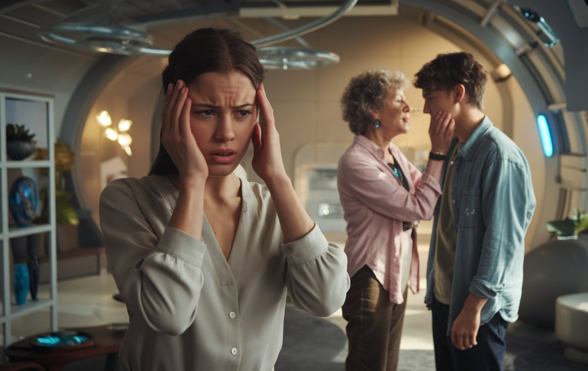 Голос матери звучит как приговор, когда она произносит: "Иди куда хочешь, я устала вас тянуть!" Эти слова обрывают невидимые нити, связывающие её с дочерью. Бледное лицо дочери сверкает в свете, но эмоции на её лице — смешение гнева и невыразимой просьбы. В воздухе повисла тяжесть осознания, что их жизни изменятся навсегда.