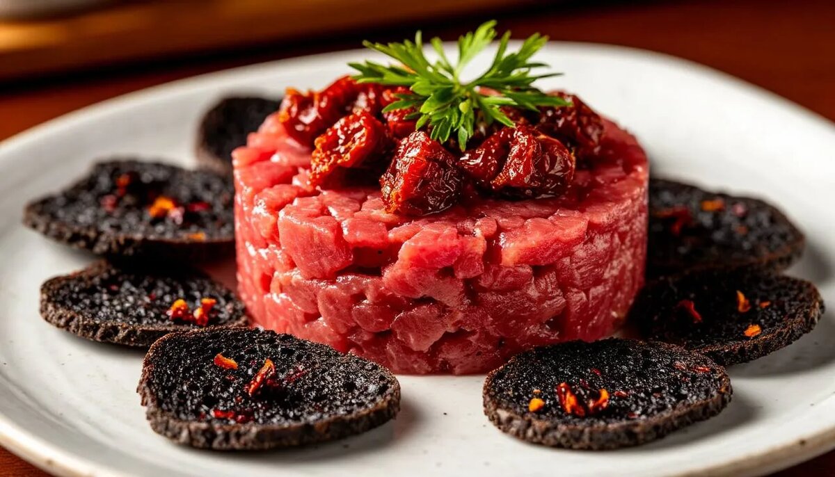 Первым делом необходимо мелко нарезать говяжью вырезку вручную, убирая мясорубку — это дело не для вкуса. Далее добавляются вяленые томаты, красный лук и каперсы. Вливаем оливковое масло, горчицу и немного лимонного сока. Перемешиваем аккуратно, словно работаем с чем-то хрупким. Тартар готов — время его дегустировать!