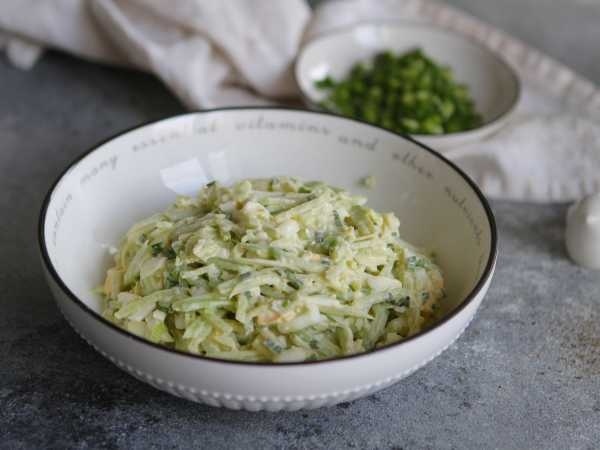 Зеленый лук нужно промыть и мелко нашинковать. Все подготовленные ингредиенты аккуратно складываются в салатник. Далее добавляется соль по вкусу, и готовый салат заправляется сметаной. Вместо сметаны можно использовать майонез, греческий йогурт или соус на основе майонеза и горчицы для более острого вкуса.
