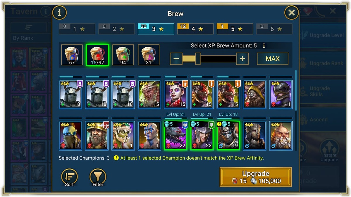 Среди главных нововведений можно выделить кнопку «Улучшение пивом», которая появилась в разделе «Повышение уровня». Теперь игрокам доступно новое меню, которое позволяет одновременно выбирать несколько чемпионов для прокачки. Как и в предыдущем режиме «Мгновенное улучшение», используются те же фильтры, что значительно упрощает процесс.