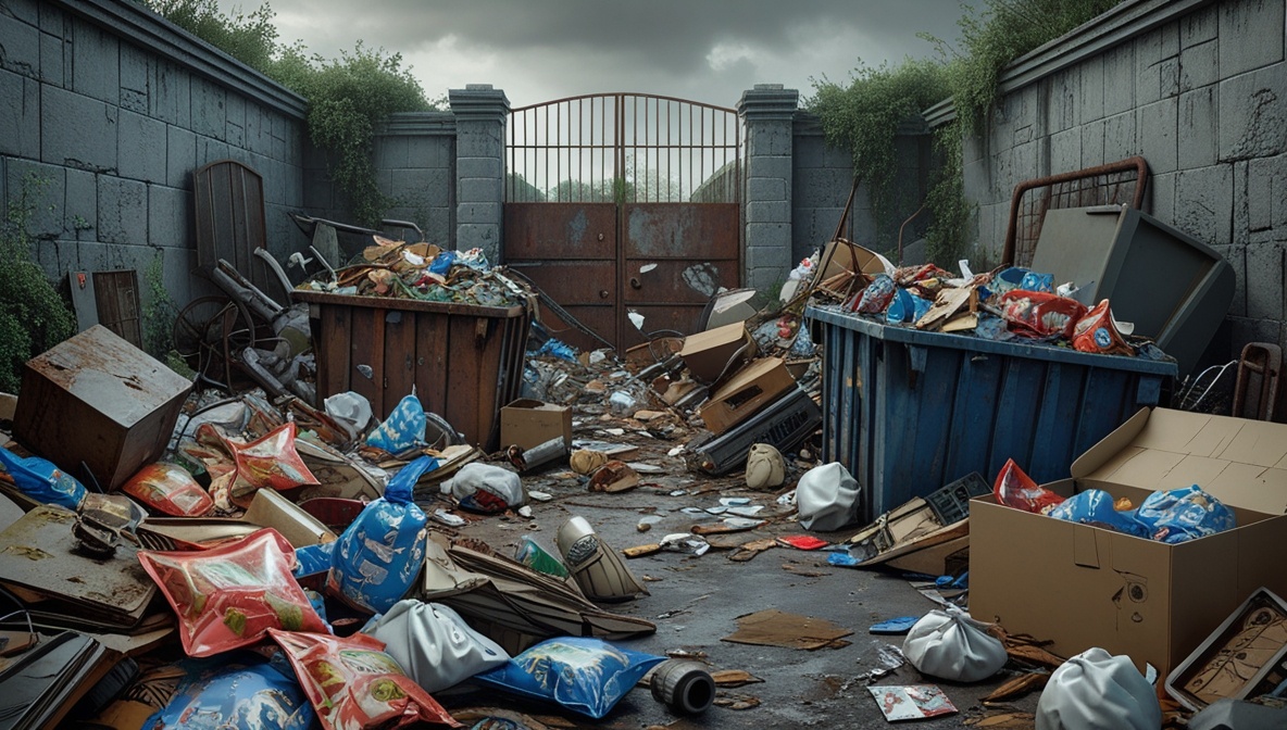 - Переполненные контейнеры и отходы, разбросанные вокруг.