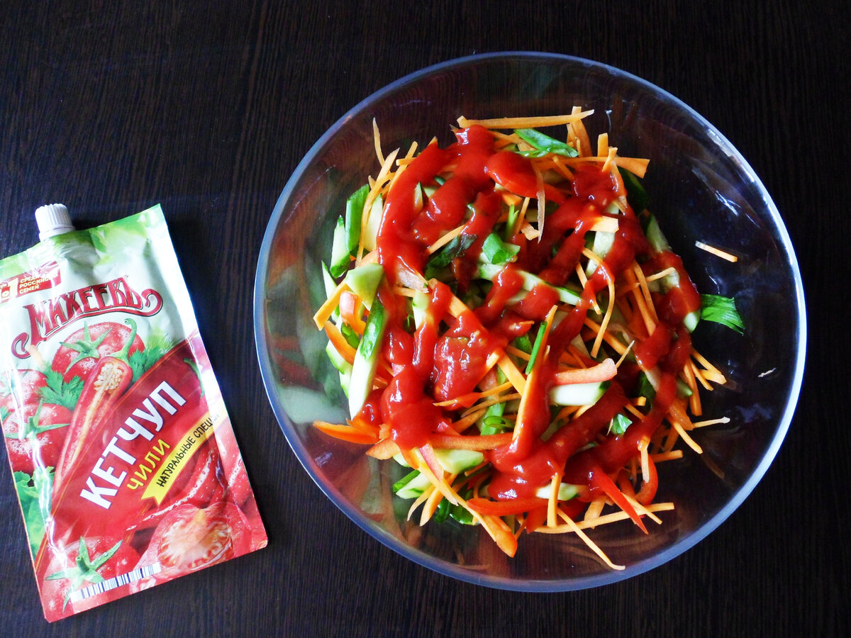 Салат состоит из основных ингредиентов: свежих огурцов, сладкого болгарского перца, моркови и зеленого лука. Эти продукты не только радуют глаз, но и добавляют питательные элементы в рацион. Заправка из оливкового масла, уксуса и острого чили-кетчупа придает салату пикантный вкус. Для любителей острого можно заменить обычный кетчуп на аджику, а тем, кто предпочитает более мягкие ароматы, рекомендуем использовать петрушку вместо кинзы.