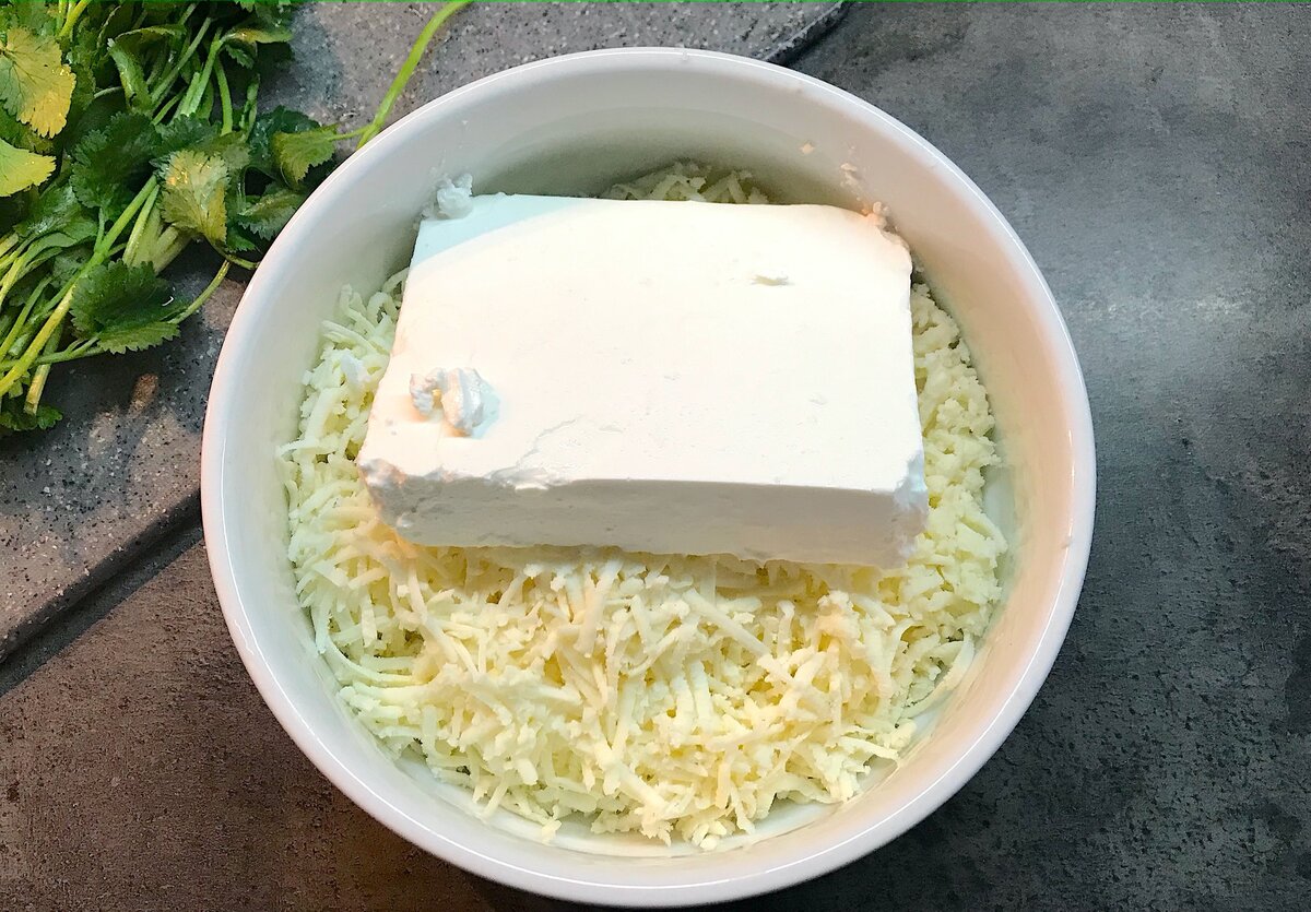Приготовление начинается с натерки адыгейского сыра на мелкой терке, после чего к нему добавляется размятый сыр Фета. Важно тщательно перемешать массу, чтобы получить однородную текстуру. Затем следуют свежая кинза, нарезанная мелкими кусочками, грецкие орехи и чеснок, пропущенный через пресс.
