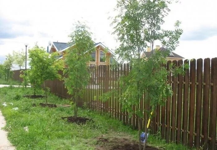 - Высокие деревья (например, дуб или береза) должны располагаться на расстоянии как минимум 4 метра от границы.