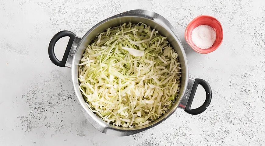 Первым делом капусту стоит нарезать тонкой соломкой. Затем поместить её в большую ёмкость, добавить одну столовую ложку соли и немного помять руками, чтобы она выделила сок и упала. Эта техника помогает улучшить текстуру и вкус будущего салата.