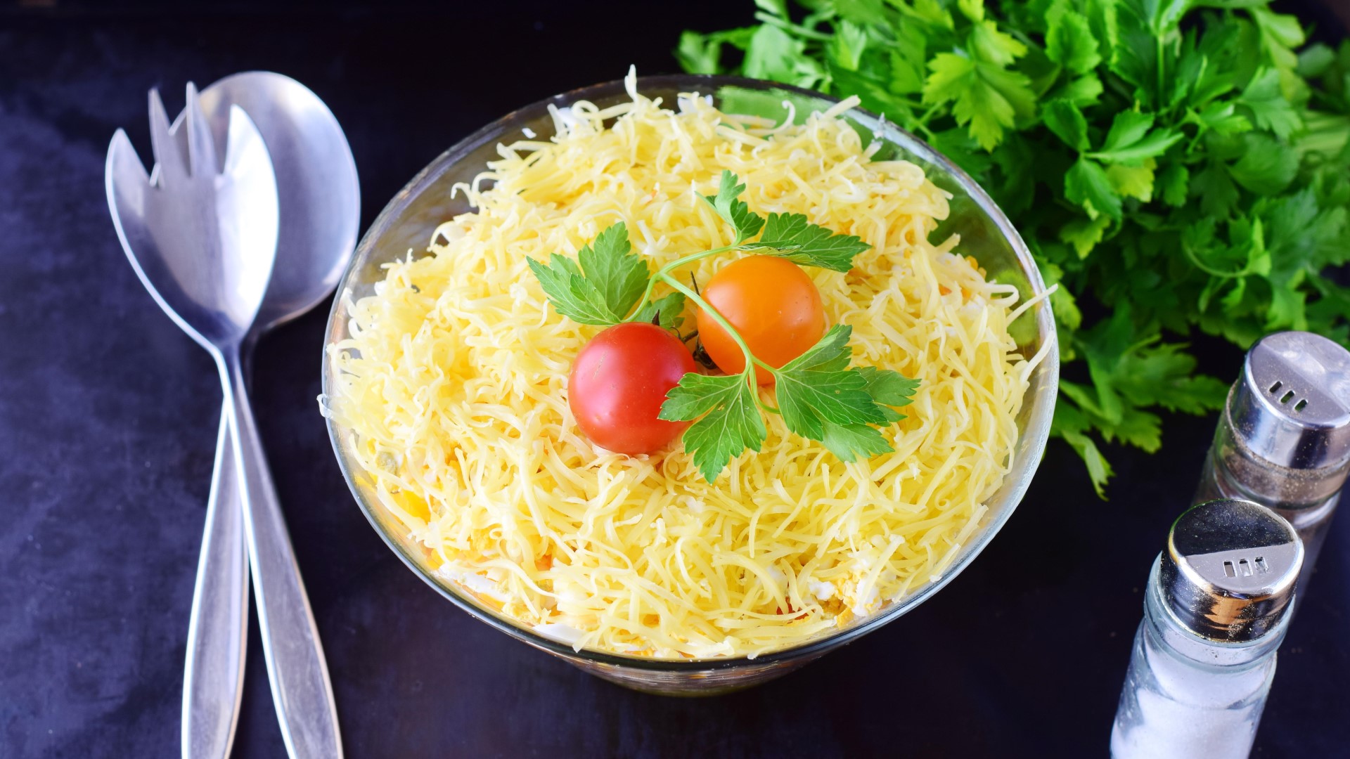 Яйца и печень отварите, а грибы обжарьте. Затем все компоненты нарежьте кубиками. Сыр натрите.