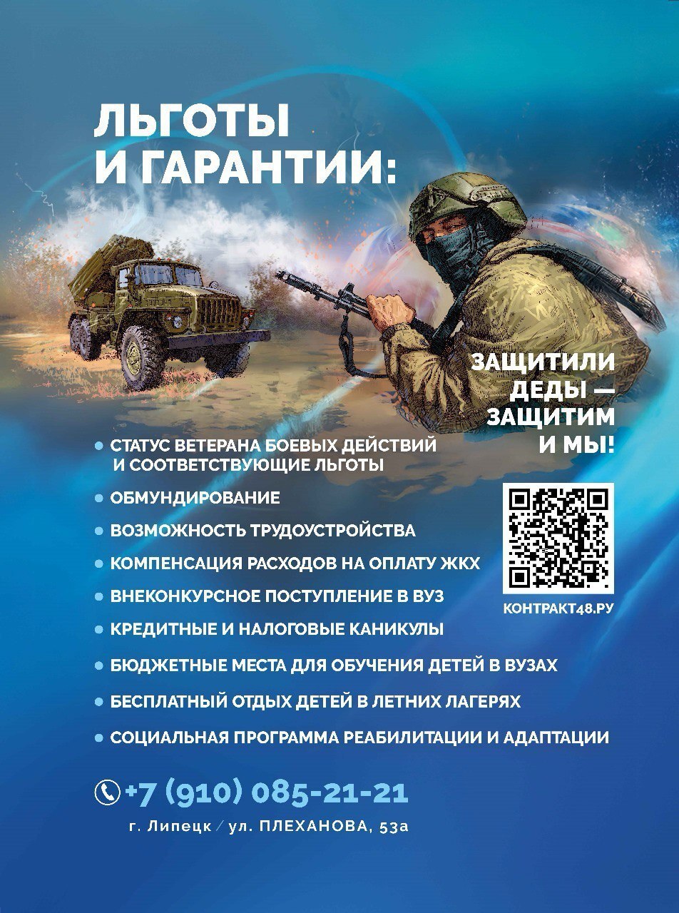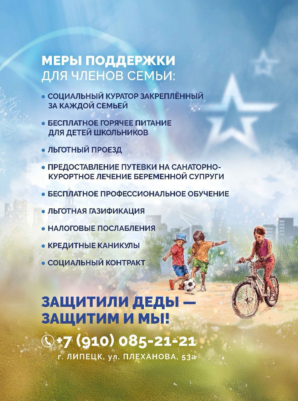 Подробнее о мерах поддержки военнослужащих и членов их семей на сайте контракт48.рф и в карточках.