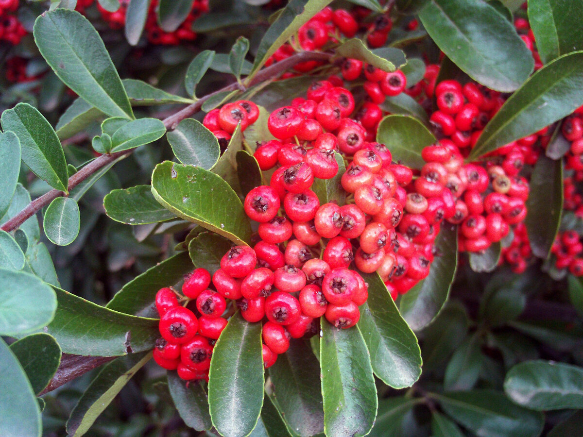 - Пираканта узколистная – быстрорастущее растение, достигающее высоты 4 м, с желтыми или оранжевыми плодами.