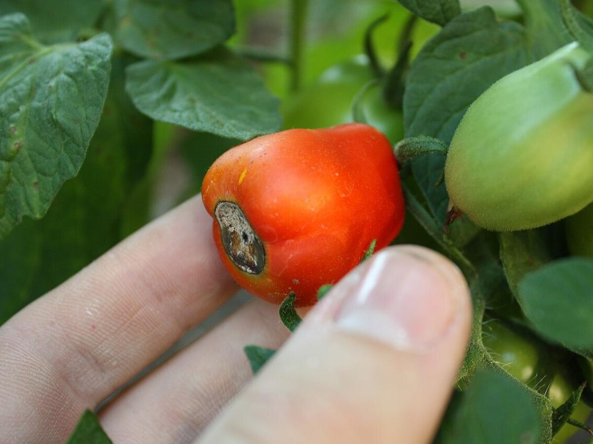 - Появление вершинной гнили: у плодов образуется водянистое пятно, которое затем темнеет и затвердевает.