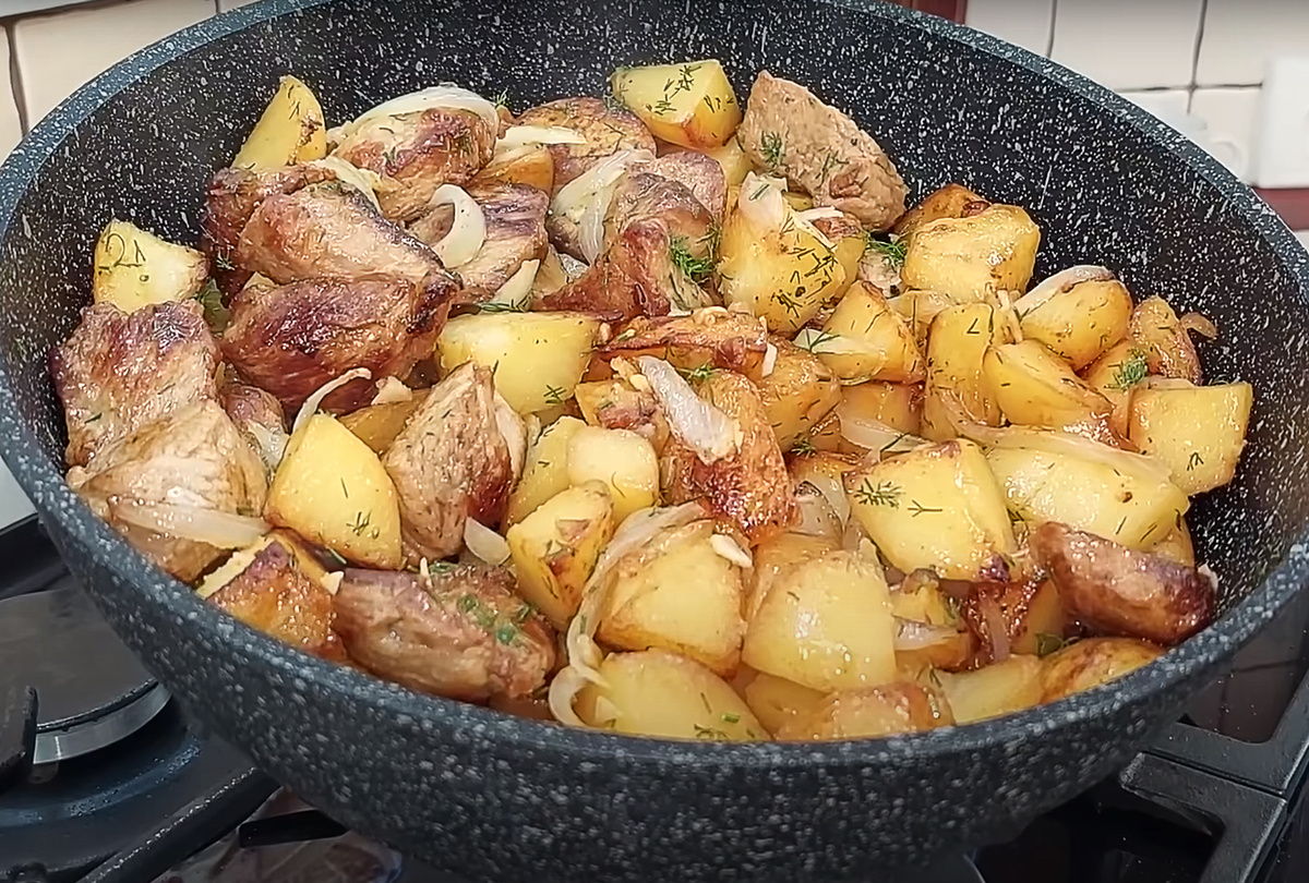 Добавьте еще немного масла на сковороду и добавьте картошку к мясу. Обжаривайте все вместе, ориентируясь на золотистый цвет. Затем добавьте лук и чеснок, накройте крышкой и дайте всем ингредиентам «подружиться» на пару минут.