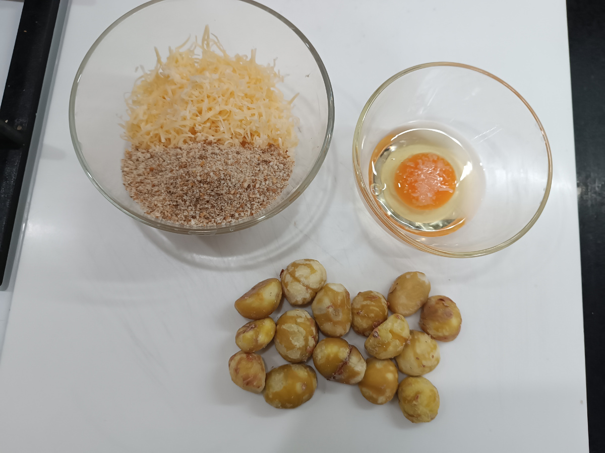Очищенные каштаны аккуратно обмакивают в яичную смесь, а затем обваливают в сырной панировке, слегка прижимая ее к ореху. Чтобы было удобнее работать, можно использовать зубочистки для нанесения панировки.