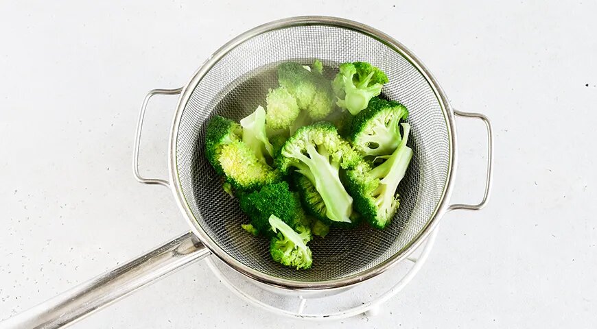 Для начала стоит заняться брокколи. Необходимо аккуратно разобрать капусту на мелкие соцветия и тщательно промыть под прохладной водой. После этого в небольшой кастрюле доводится до кипения подсоленная вода. Как только вода закипит, соцветия брокколи отправляются вариться на 3 минуты. Это поможет сохранить их цвет и текстуру. После бланшировки брокколи стекает в дуршлак, чтобы избавиться от лишней влаги.
