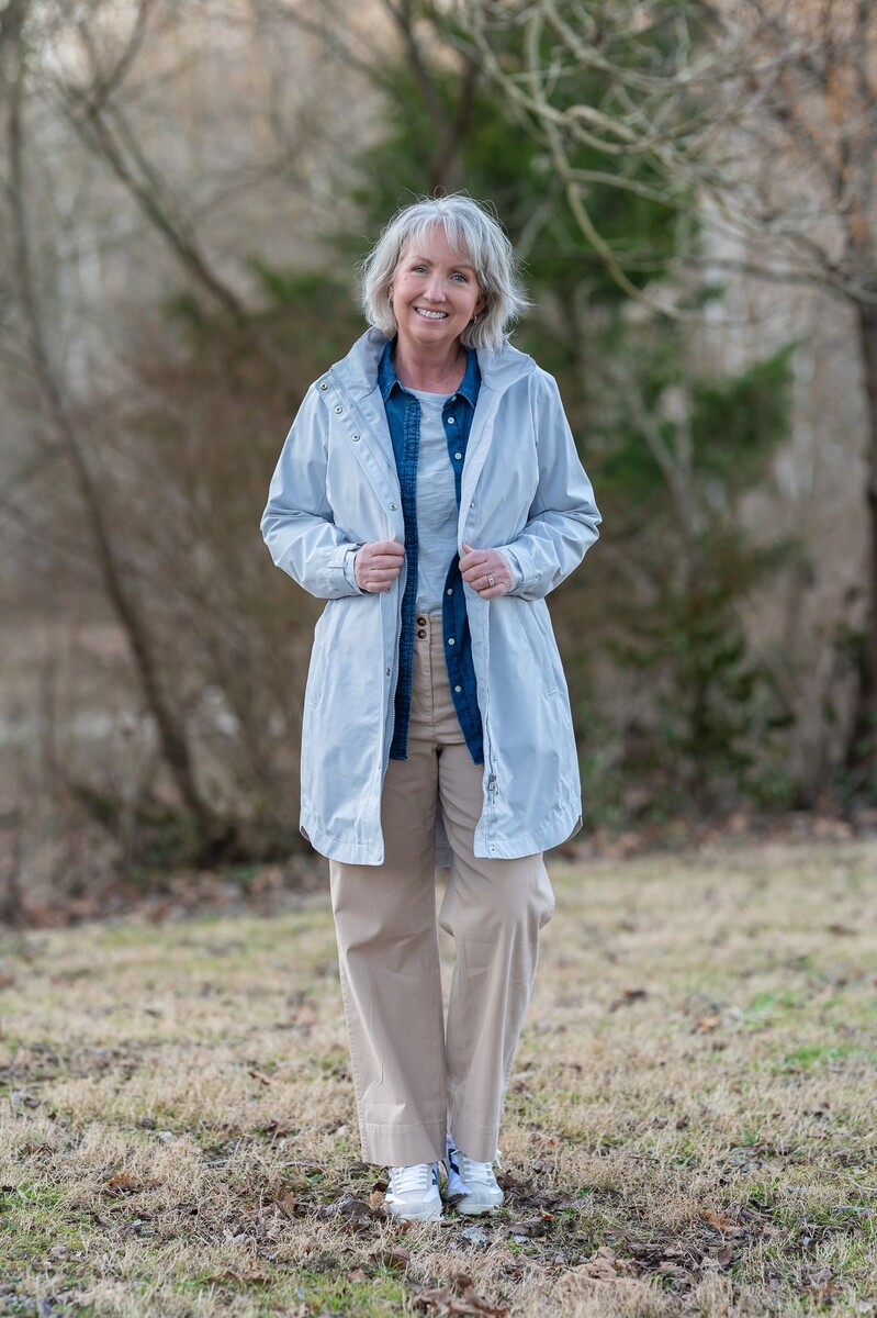 - Комфорт и стиль: Широкие бежевые брюки прямого кроя становятся основой данного ансамбля. В сочетании со светло-серой футболкой, темно-синей джинсовой рубашкой и удлиненной светло-голубой курткой-ветровкой создается гармоничный силуэт, который идеально подходит для осенней прохлады.