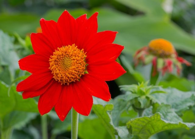 Титония, или Tithonia rotundifolia, может достигать высоты 1,2–1,8 метра, а в благоприятных условиях — еще выше. Растение имеет мощный стебель, который нуждается в поддержке, особенно в ветреную погоду. Темно-зеленые листья, длиной от 7 до 30 см, имеют как цельную, так и лопастную форму с зубчатыми краями и мягкими волосками на поверхности.