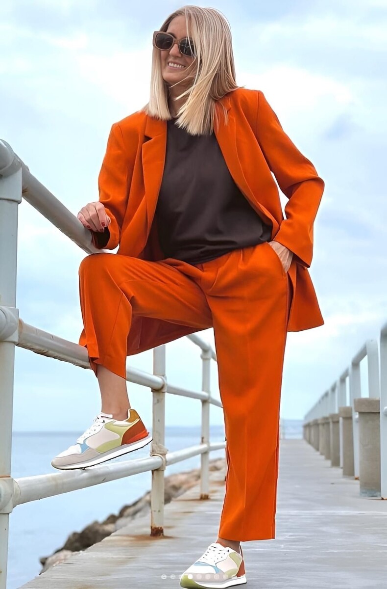 - Терракотовый костюм: Элегантный комплект, состоящий из классических брюк со стрелками и жакета оверсайз, в насыщенном терракотовом цвете, станет оммажем отличного вкуса и современного подхода к моде. Этот наряд великолепно контрастирует с черной шелковой блузкой и яркими кроссовками.