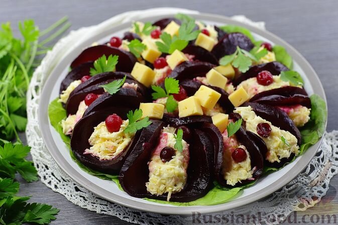 - Закуска из свёклы с сыром и чесноком: это простое, но эффектное блюдо идеально подойдёт для праздничного стола. Слои вареной свёклы чередуются с насыщенной сырно-чесночной начинкой. Такой аппетитный вид и аромат обязательно привлечёт внимание гостей.