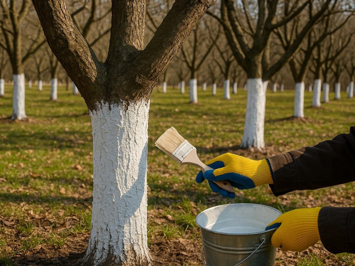 - Подновление: В конце февраля — начале марта, когда почки ещё не распустились, побелку стоит обновить, особенно если осенью это не было сделано.