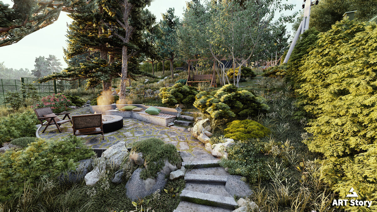 Для повышения удобства жизни на участке была предусмотрена множество уютных зон. У подпорной стенки дома разместили валуны с почвопокровными растениями, которые создают естественный вид. В саду установлены качели с живописным видом на зону очага. В северной части расположен уютный уголок — беседка с деревянным настилом, где можно насладиться уютным вечером, угощаясь угощениями с большой обеденной таблицей и печью.