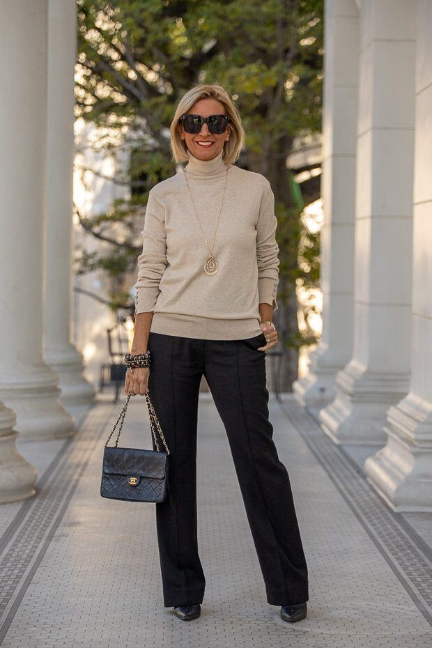 1. Бежевый уют: Теплая бежевая водолазка с декоративными пуговицами прекрасно сочетается с классическими черными брюками со стрелками. Этот элегантный и сдержанный лук отличается удобством и подойдет для любой ситуации. Завершить образ можно черными туфлями на небольшом каблуке.
